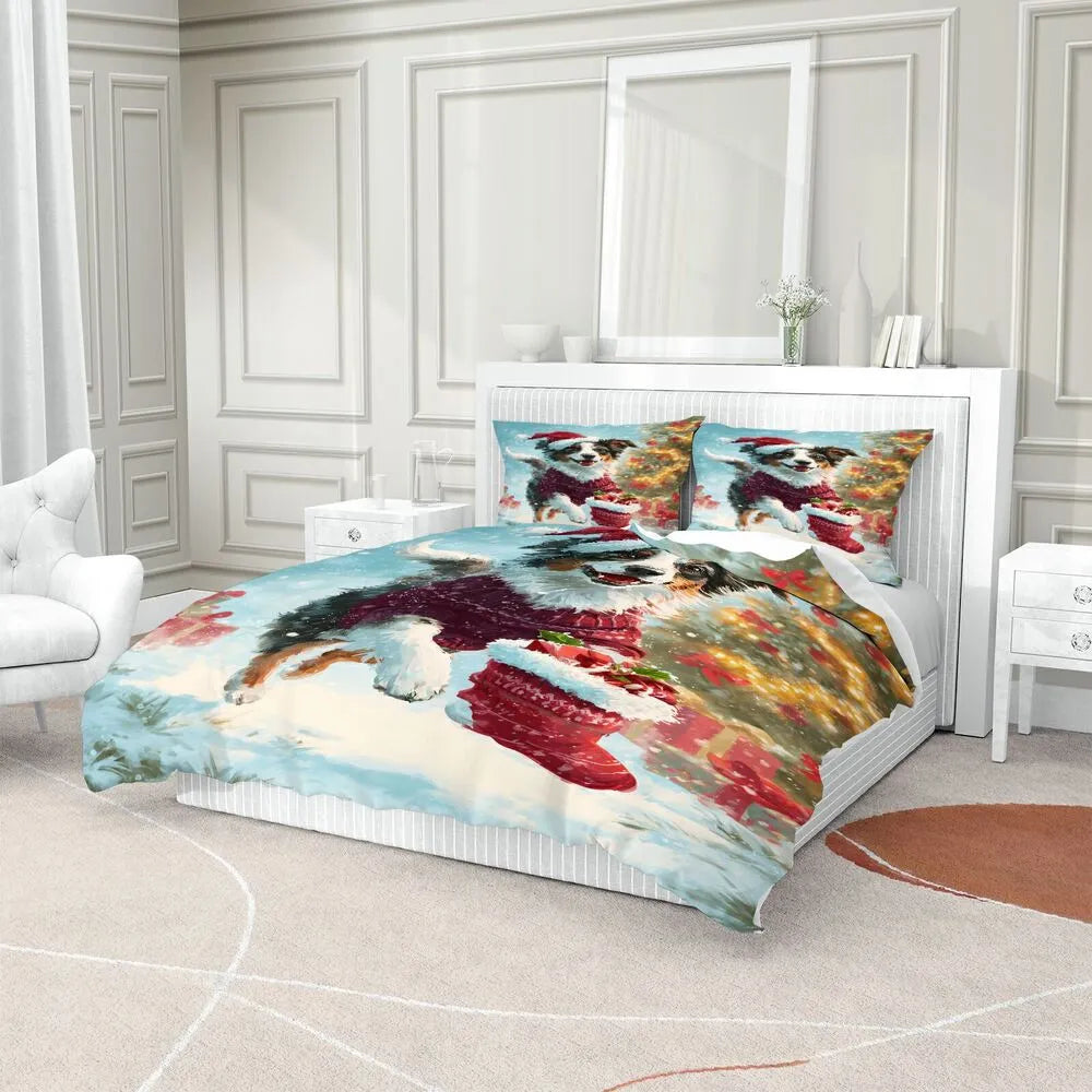 Christmas Aussie Dog Santa Sweater Stocking Blue Christmas Gift Duvet Cover Set Kids Bedding Set