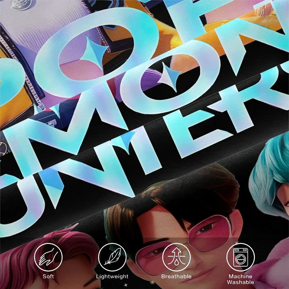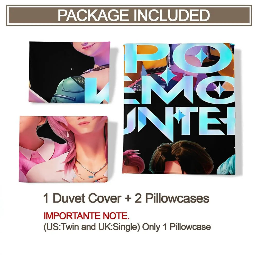 Elevate your bedroom with this K-POP Demon Hunters bedding set. Featuring a vibrant collage-style anime design of diverse group members, it merges K-POP trend and dynamic artistry. Crafted from premium fabric, it offers a comfortable and stylish sleeping experience, perfect for fans wanting to infuse their space with trendy, fan-centric energy.