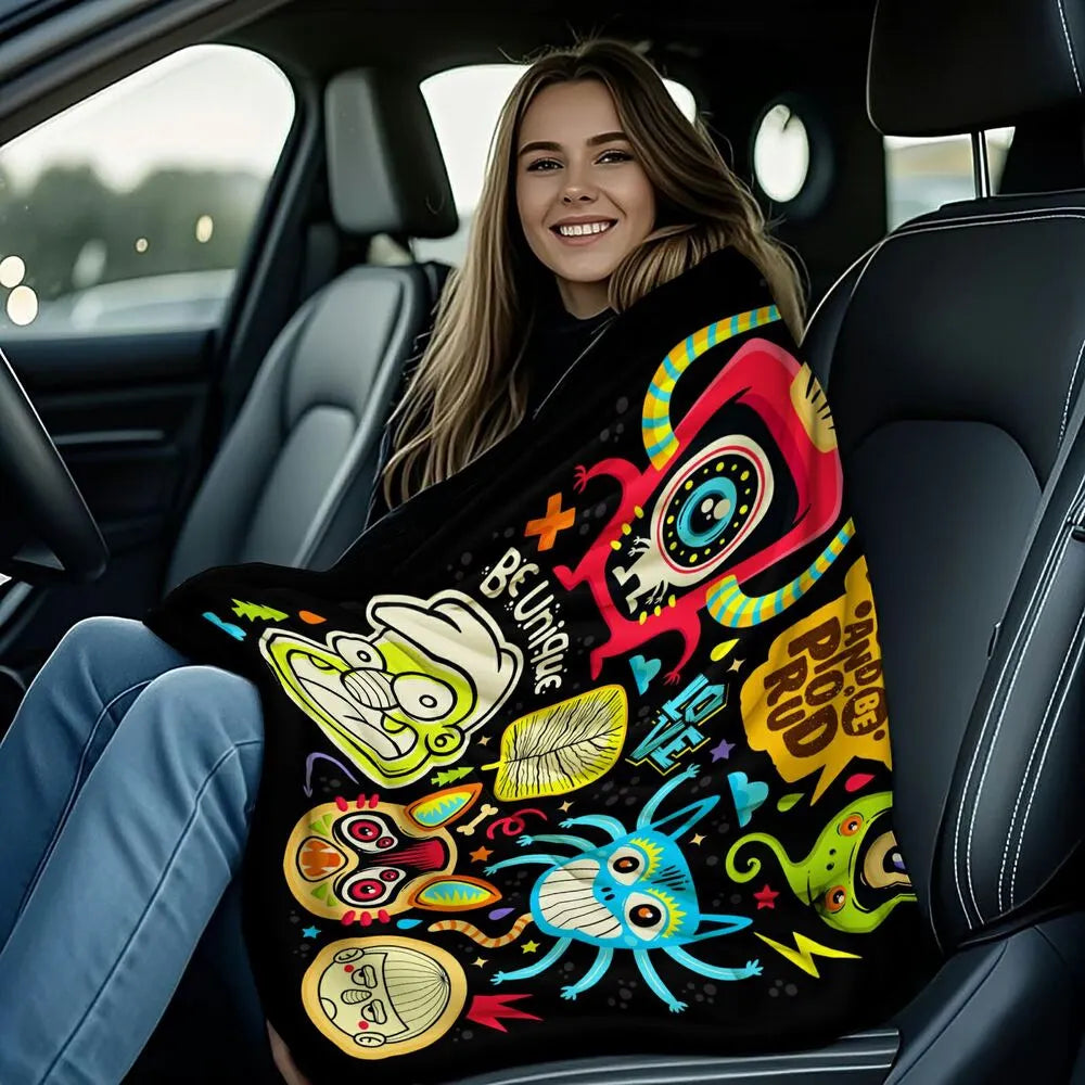 Introducing our Colorful Cartoon Monsters "Be Unique" Pattern Multipurpose Throw Blanket! Featuring a vibrant design with various cartoon monsters and inspiring “Be Unique” text, this blanket is perfect for adding a playful and empowering touch. It can be used as a nap blanket, sofa blanket, travel blanket, picnic blanket, camping blanket, beach blanket, or car blanket. Made from soft fabric, it offers comfort while bringing a fun, unique vibe to any occasion.