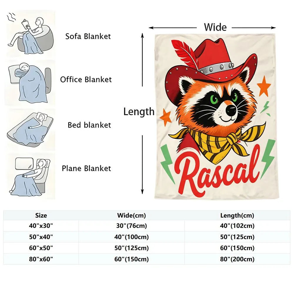 Introducing our Cowboy Red Panda "Rascal" Multipurpose Throw Blanket! Featuring a charming red panda dressed as a cowboy with the name "Rascal", this blanket is as playful as it is versatile. Whether you're napping, lounging on the sofa, having a picnic, camping, at the beach, traveling, or staying cozy in the car, this blanket has you covered. Made with soft fabric, it offers comfort and a touch of whimsy for all your moments.