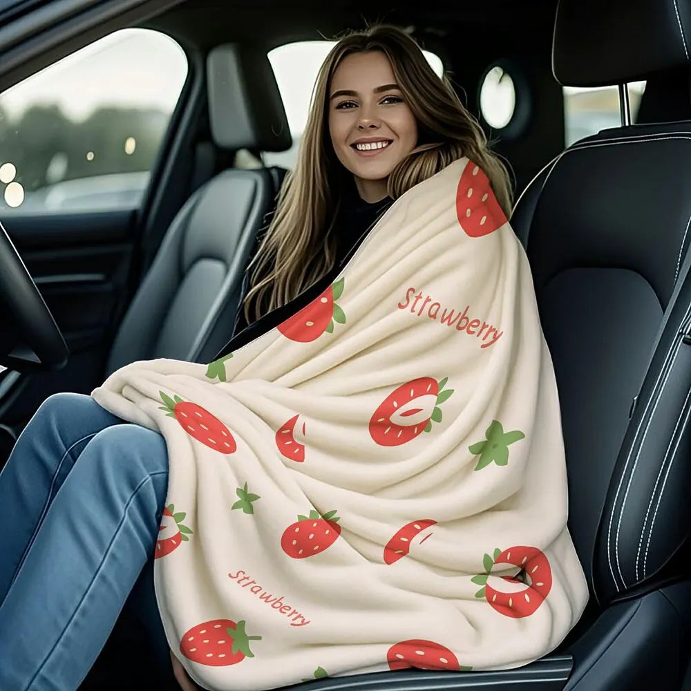 Introducing our Strawberry - Themed Multipurpose Throw Blanket! Decorated with cute strawberries and the word "Strawberry", this blanket is not only visually appealing but also highly versatile. Whether you're taking a nap, relaxing on the sofa, having a picnic, going camping, enjoying a day at the beach, traveling, or needing an extra layer in the car, this blanket is your perfect companion. Made from soft fabric, it offers both comfort and a touch of fruity charm to your life.