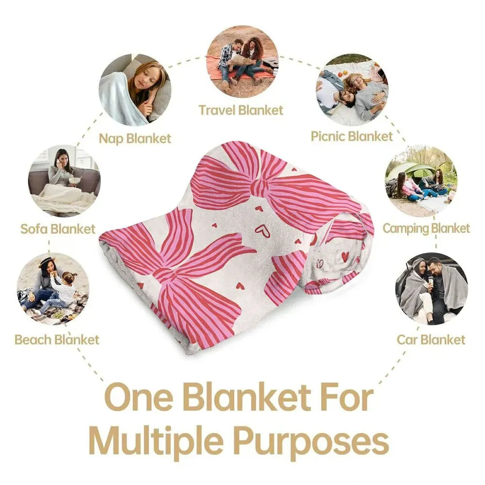 Introducing our Pink Bow and Heart Pattern Multipurpose Throw Blanket! Featuring lovely pink bow and heart designs on a white background, this blanket adds a sweet and romantic touch to any space. It's perfect as a nap blanket, sofa blanket, travel companion, picnic essential, camping must - have, beach accessory, or car blanket. Made from soft fabric, it offers comfort while bringing a delightful, feminine touch to any occasion.