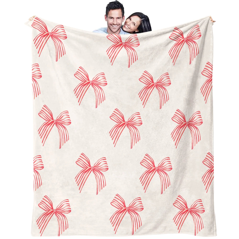 Introducing our Red Bow Pattern Multipurpose Throw Blanket! Featuring charming red bow designs on a crisp white background, this blanket adds a sweet and stylish touch to any space. It's perfect as a nap blanket, sofa blanket, travel companion, picnic essential, camping must - have, beach accessory, or car blanket. Made from soft fabric, it offers comfort while bringing a lovely, feminine touch to any occasion.