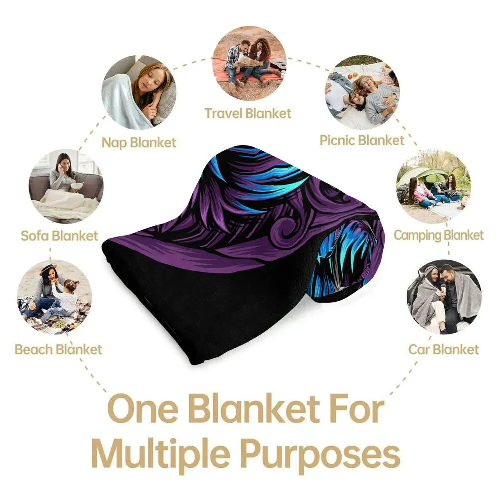 Introducing our Artistic Purple and Blue Wolf Pattern Multipurpose Throw Blanket! Featuring a stunning artistic design of a wolf with vibrant purple and blue hues on a black background, this blanket is perfect for adding a touch of artistry and charm. It can be used as a nap blanket, sofa blanket, travel blanket, picnic blanket, camping blanket, beach blanket, or car blanket. Made from soft fabric, it offers comfort while bringing a unique, stylish vibe to any occasion.