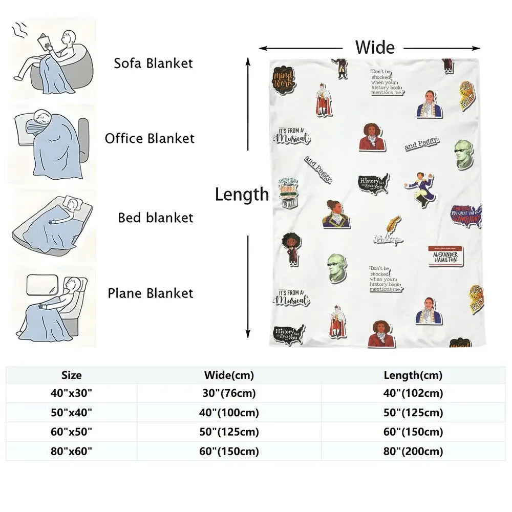 Introducing our Hamilton Musical Themed Multipurpose Throw Blanket! Adorned with iconic designs and quotes from the beloved Hamilton musical, this blanket is a must - have for fans. Perfect as a nap blanket, sofa blanket, travel companion, picnic essential, camping must - have, beach accessory, or car blanket, it's incredibly versatile. Made from soft fabric, it offers comfort while celebrating the magic of Hamilton.