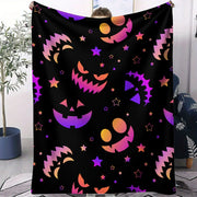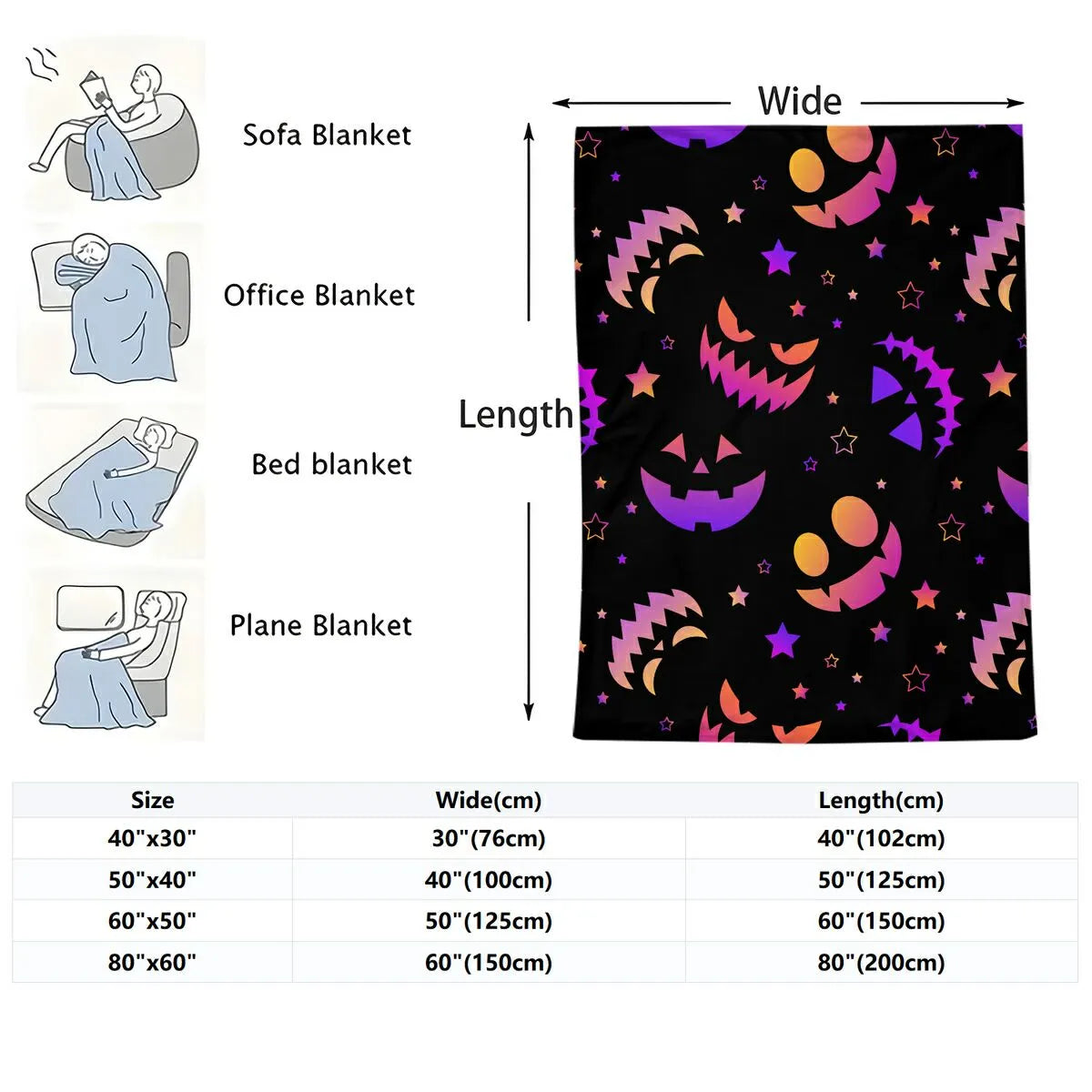 Dive into Halloween spirit with this gradient flannel blanket! Featuring colorful pumpkin faces and stars on a black backdrop, it’s soft and perfect for sofa lounging, napping, travel, picnics, camping, beach trips, or car rides. A versatile piece that adds vibrant spooky charm while keeping you cozy.