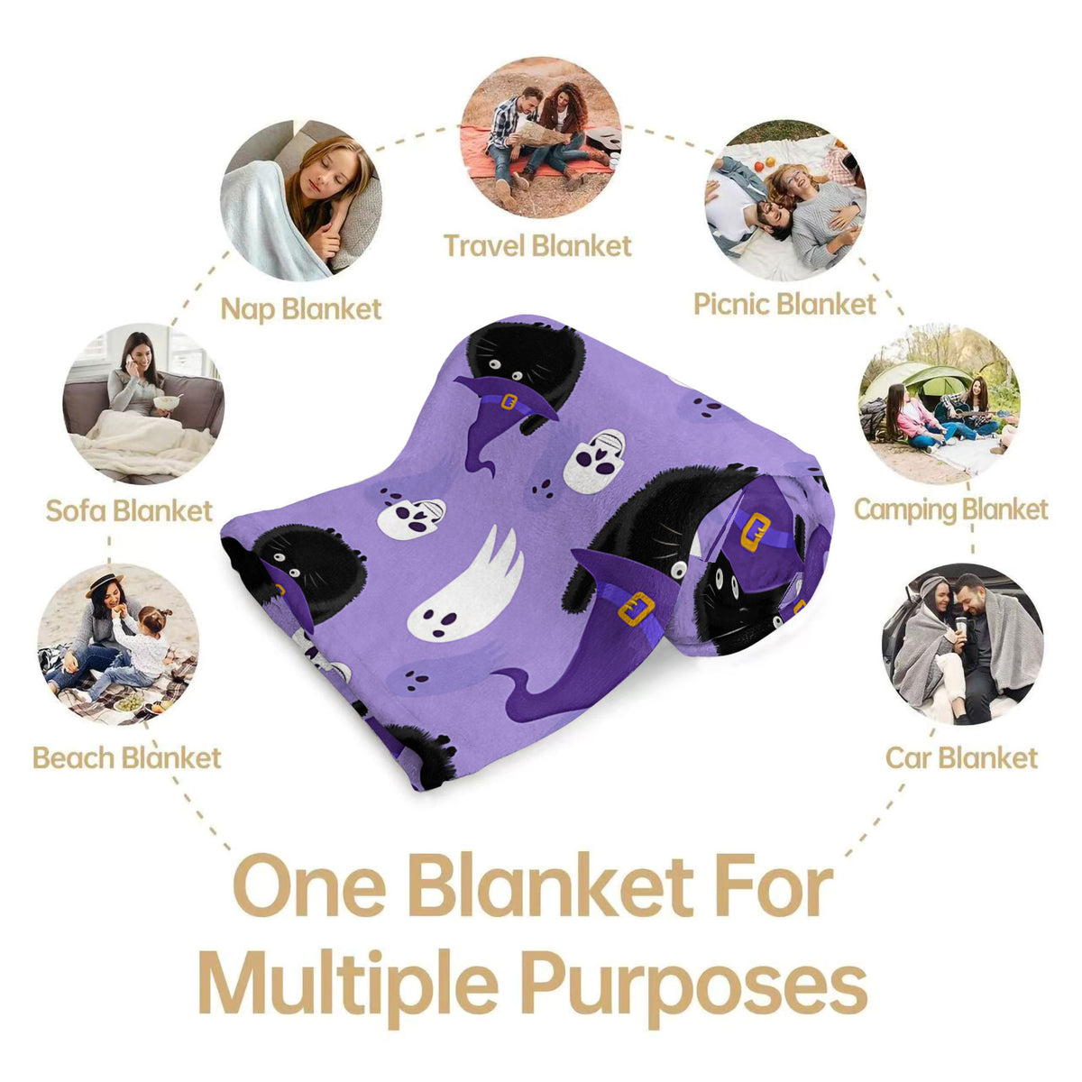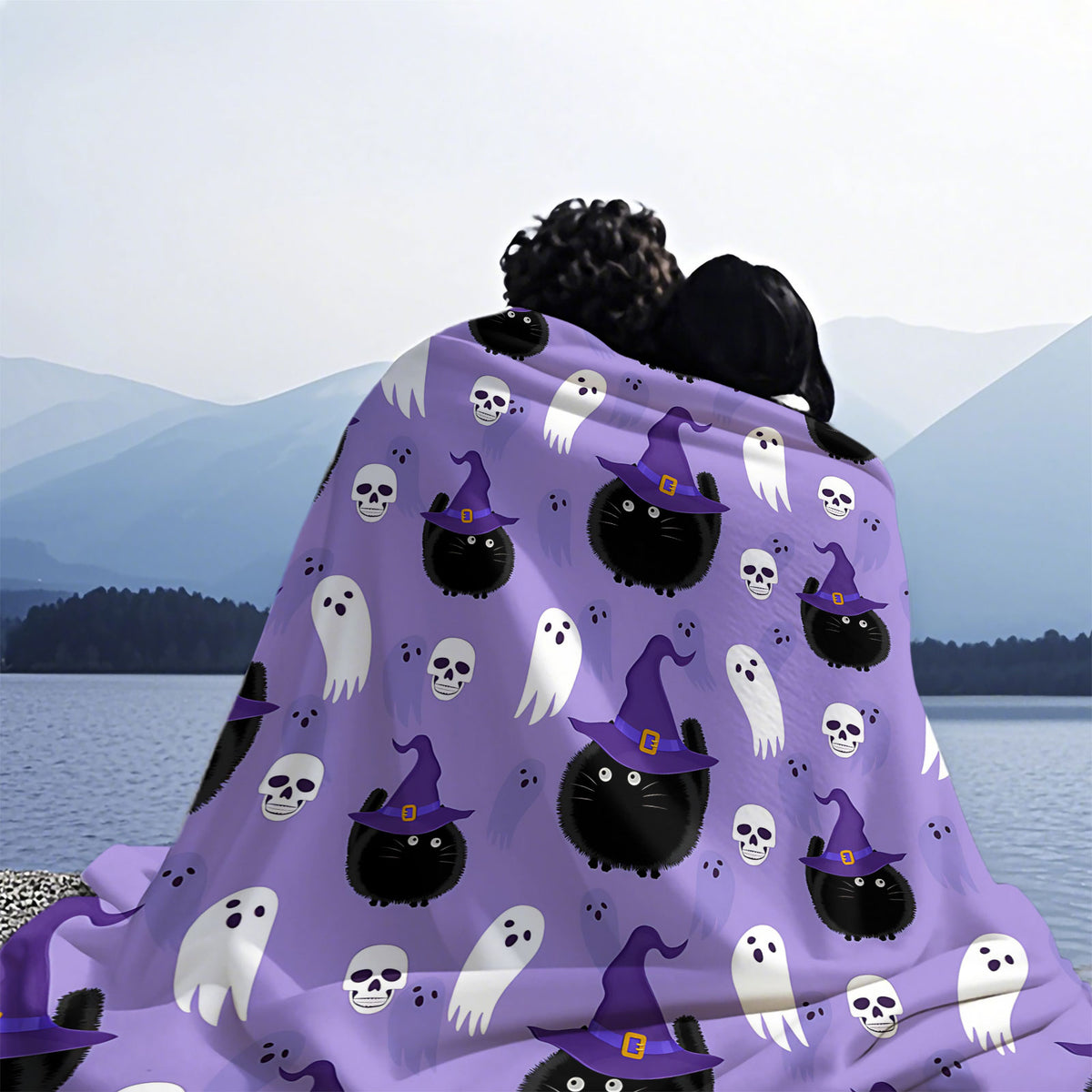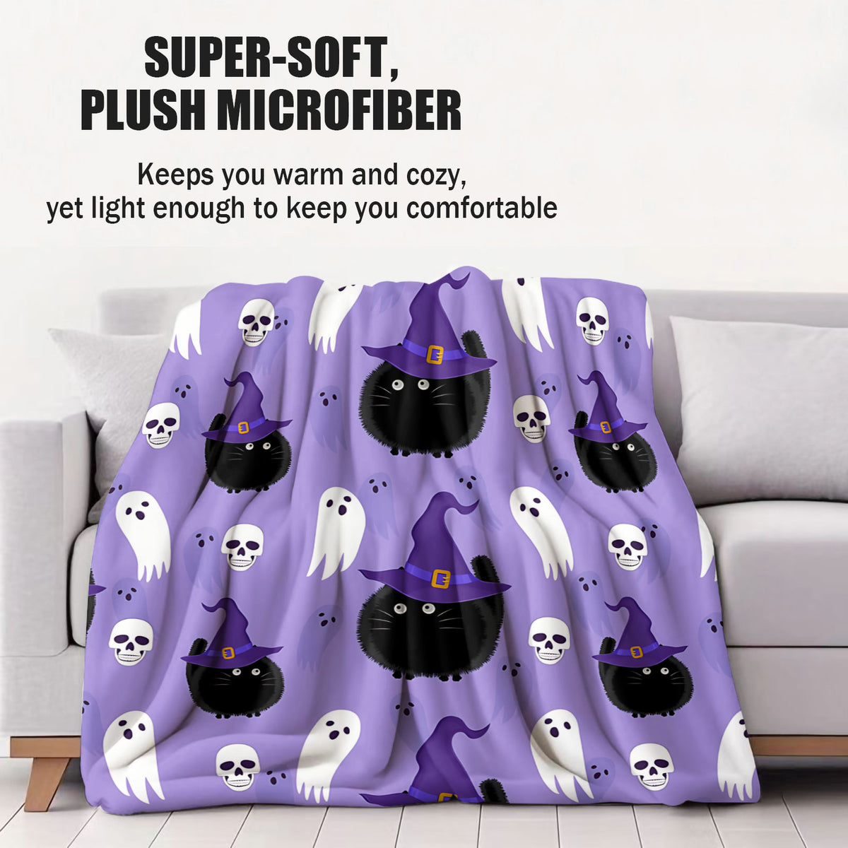 Get into the Halloween spirit with our adorable throw blanket! Featuring fluffy black cats in witch hats, friendly ghosts, and playful skulls on a soft purple backdrop, it’s the perfect mix of spooky and cute. Made for cozy nights or decking out your space, this blanket adds instant Halloween charm to couches, beds, or movie marathons. Soft to the touch and designed to last, it’s a must - have for Halloween lovers. Snuggle up in style – your festive decor just got an upgrade!