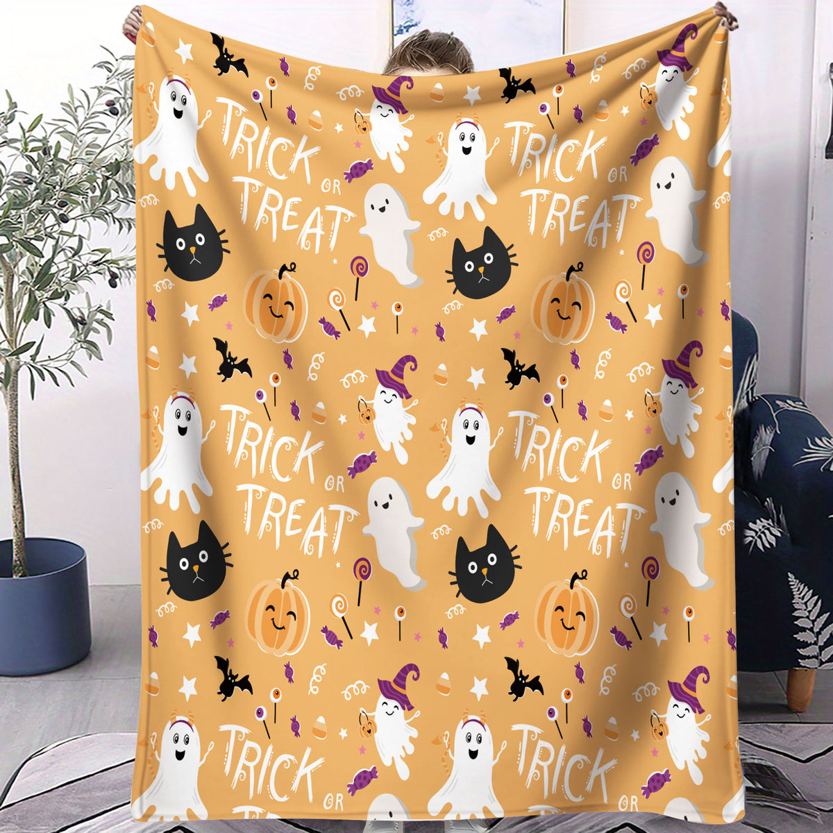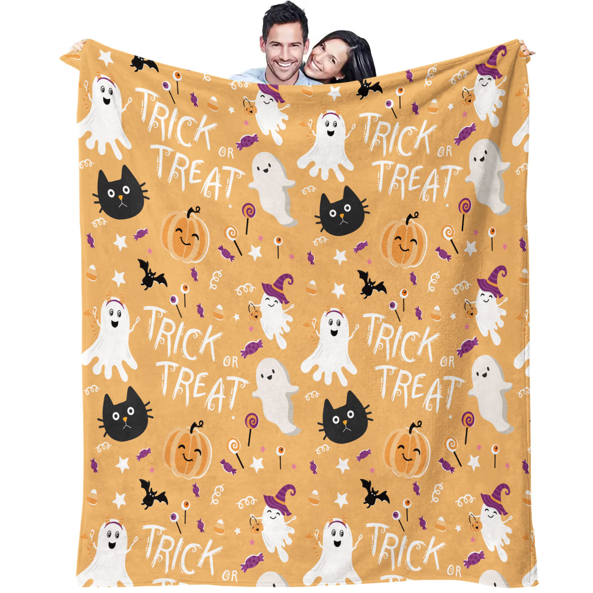 Trick or Treat Cozy Flannel Blanket for Sofa & Bed.Bring festive fun to your home with our Halloween Ghost Cat Pumpkin Throw Blanket! Adorned with cute ghosts, black cats, smiling pumpkins, and “Trick or Treat” text, this golden-yellow blanket is perfect for Halloween decor. Crafted from soft flannel, it offers warmth for couch lounging, bedtime, or adding a spooky-cute vibe to any space. Ideal for Halloween lovers—snuggle up in seasonal charm!