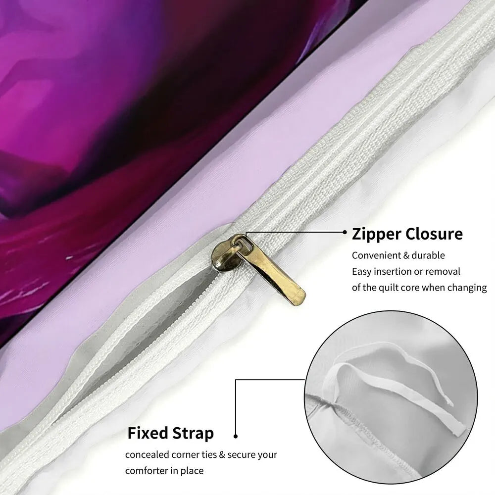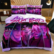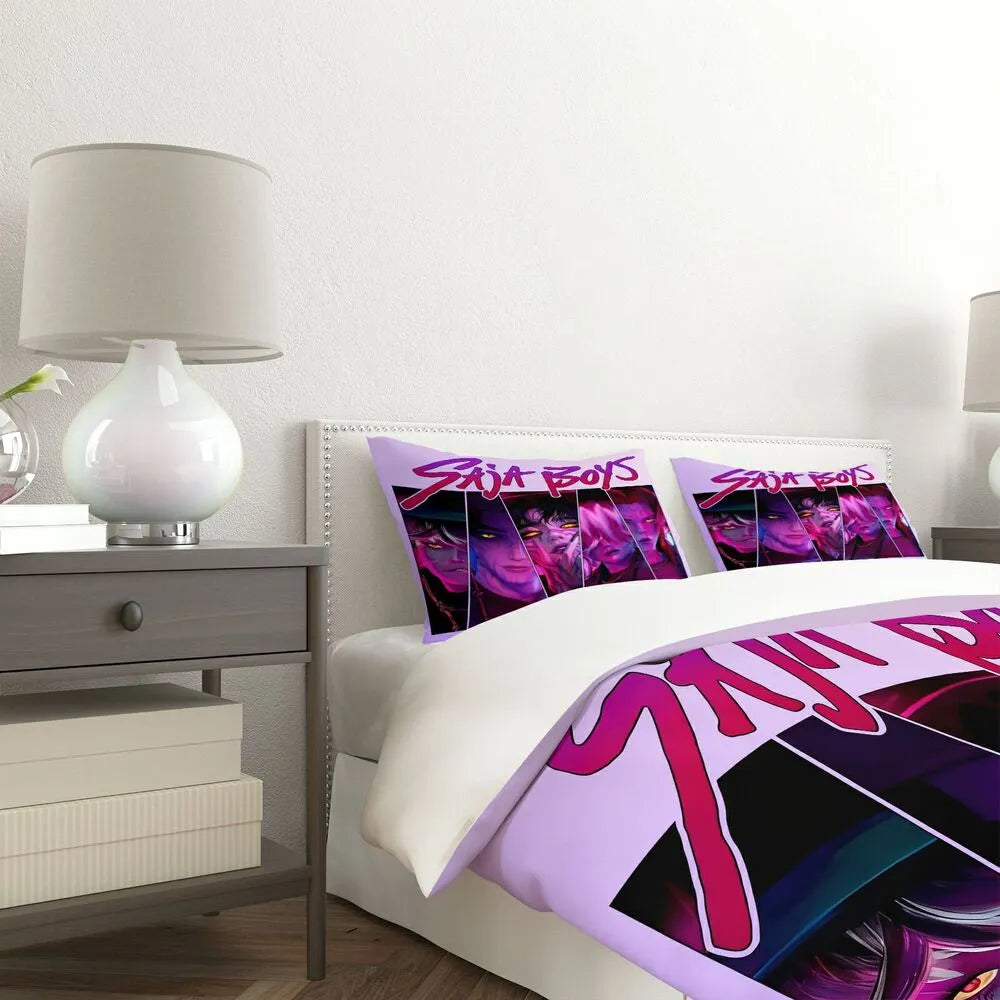 Elevate your bedroom with this K-POP Demon Hunters style Saja Boys bedding set. Featuring striking anime-style artwork of the Saja Boys group with vibrant purple-pink hues, it brings a unique blend of K-POP trend and anime artistry to your space. Crafted from premium fabric, it offers a comfortable and stylish sleeping experience, making it a perfect choice for fans who want to infuse their bedroom with edgy and trendy vibes.